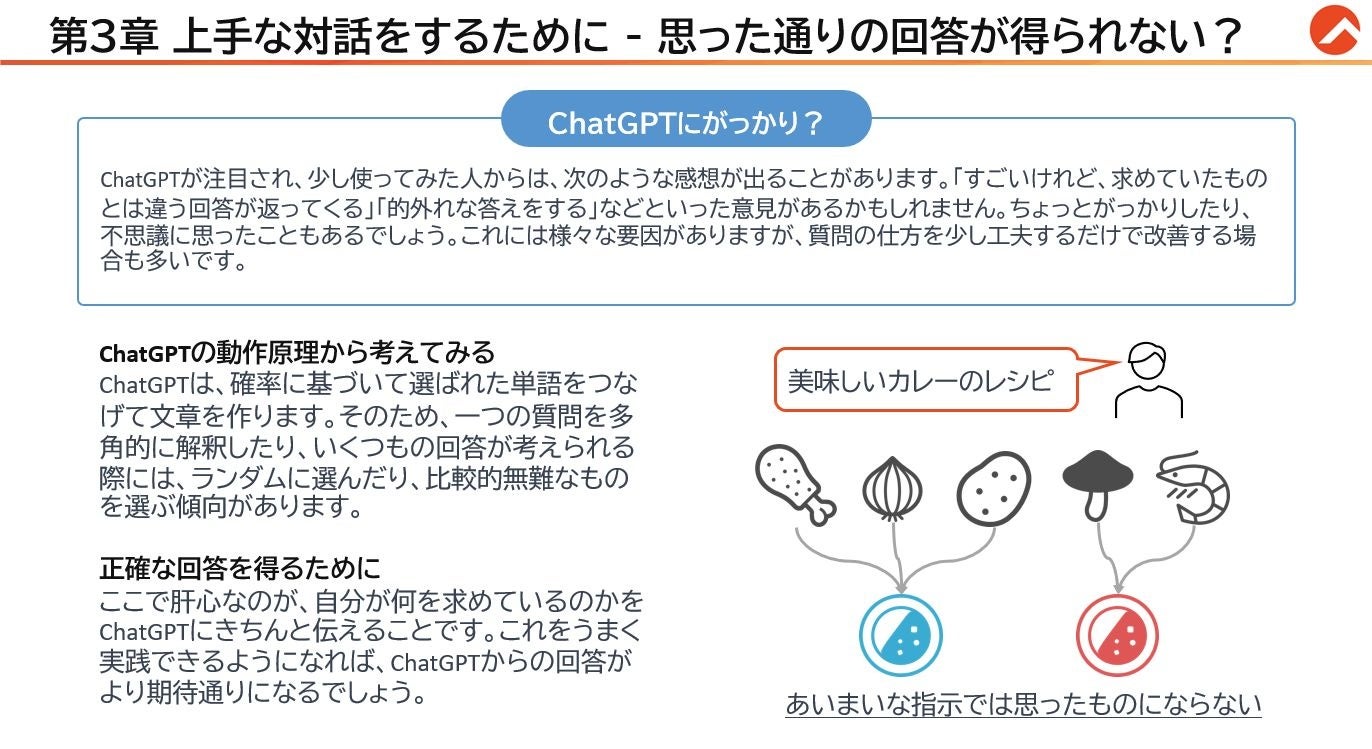 こうした状況の一因として、利用者が「使うことでリスクがあるのでは?」「業務での活用方法が分からない」「使ってみたが、思ったような答えが出てこない」などの疑問を持っていることが考えられます。これらは、基本的な概要やリスク、適切な質問の仕方などの使い方のコツを理解することで解消が可能です。